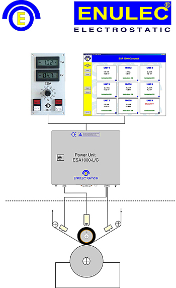 ENULEC靜電印刷輔助吸墨系統的工作原理就是靜電放電器產生放電電流,電流通過經過壓印輥上的半導體導電層與油墨分子形成電場,從而使油墨電極化,朝著印刷材料的方向移動,以取得更好的油墨印刷效果。同時為了達到更好的除塵效果和安全的需要,還需在壓印輥的前后安裝靜電消除裝置。