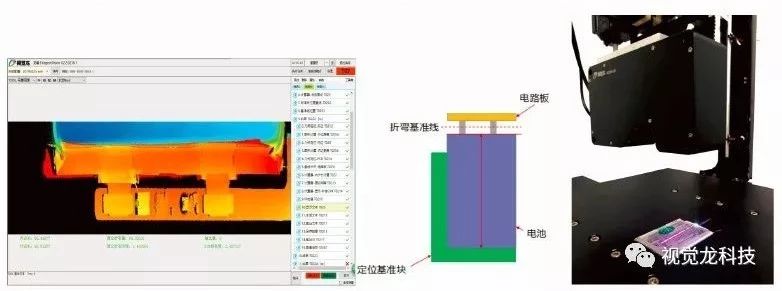 本項目采用視覺龍自主研發(fā)的VD300系列3D相機結合龍睿DragonVision視覺平臺。通過VD300-10準確測量出電池的折彎線后,反饋給折彎機械手進行折彎;折彎后對折彎間隙進行檢測,確保折彎后PCB板與電池內邊本體的間隙為0.3mm,動態(tài)重復精度0.02mm。